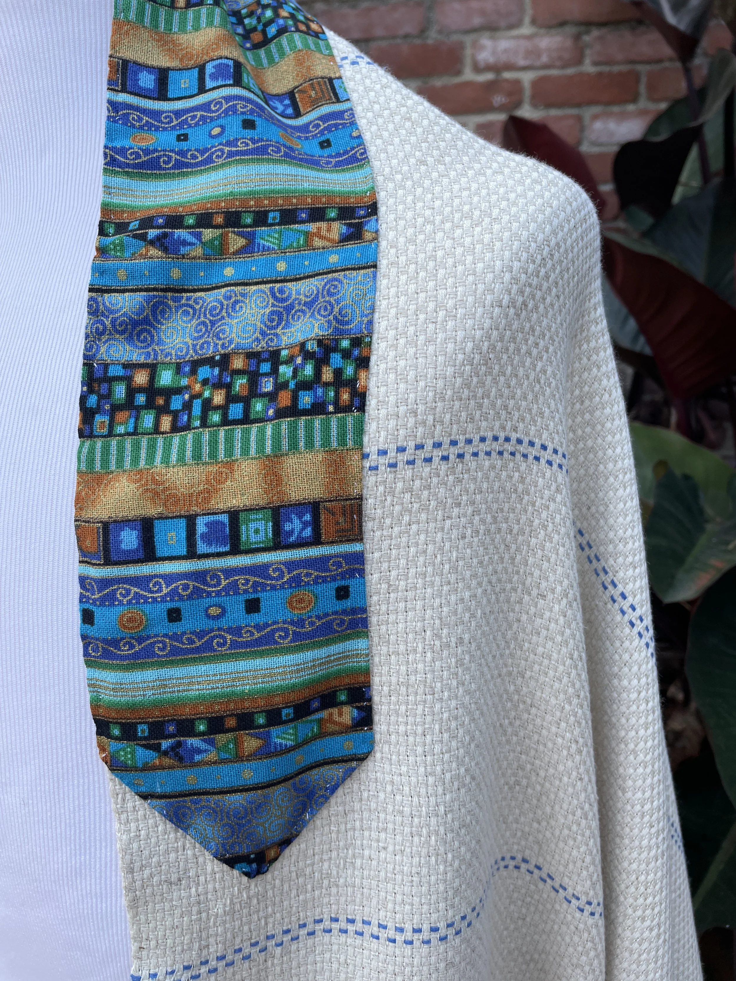 The High Holy Days are behind us and the living hostages are home. Peace is a real possibility and the inspiration for this one of a kind brand new tallit. 74” x 35” in hand woven Turkish blue and white Turkish cotton enhanced with a 34” x 3” cotton attarah in vibrant blues, gilds, and browns $500